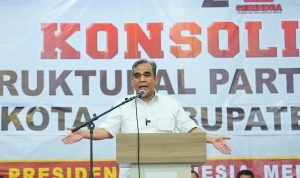 Sekjen Partai Gerindra Ahmad Muzani menghadiri konsolidasi bersama ribuan kader di Kabupaten Tegal dan Kota Tegal, Kamis (9/11). Dalam sambutannya Muzani menyinggung adanya ketidaksukaan terhadap pasangan capres cawapres Prabowo Subianto-Gibran Rakabuming Raka yang akan berkontestasi pada Pilpres 2024.